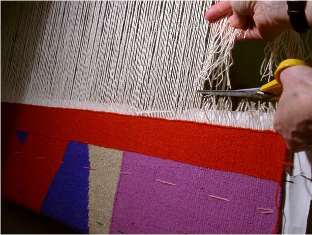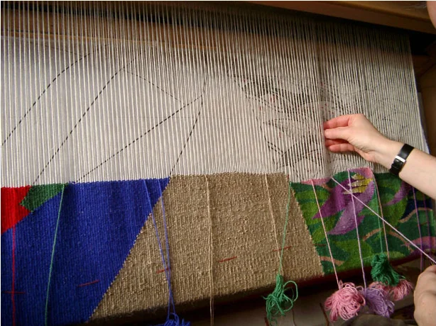 The image grows millimetre by millimetre. Small bundles (butterflies) of coloured weft are hand threaded alternately, in front and behind, the taut vertical warp and compacted down. Gradually the tapestry is built, by the precise positioning of this dense coloured weft, as it completely covers the warp.